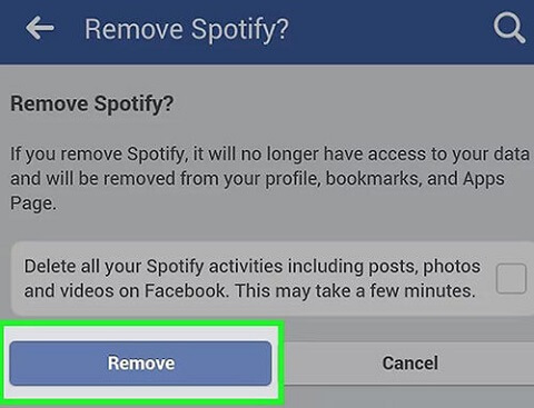 A remove confirmation pop up window will open. But you can go to your facebook page app to remove the integrated spotify app too you can do this via computers or mobile devices. At the bottom of the pop up window click remove. Run spotify again and reconnect to facebook.